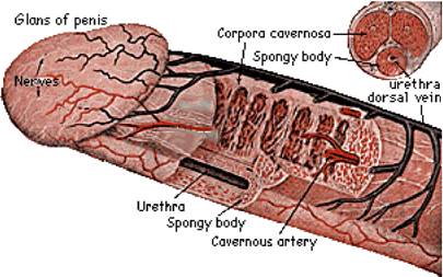 القضيب يتكون من جسم إسفنجي وهو المسئول عن القدرة على الانتصاب وبداخل القضيب يوجد قناة تدعى قناة البول يمر من خلالها البول وكذلك الحيوانات المنويه