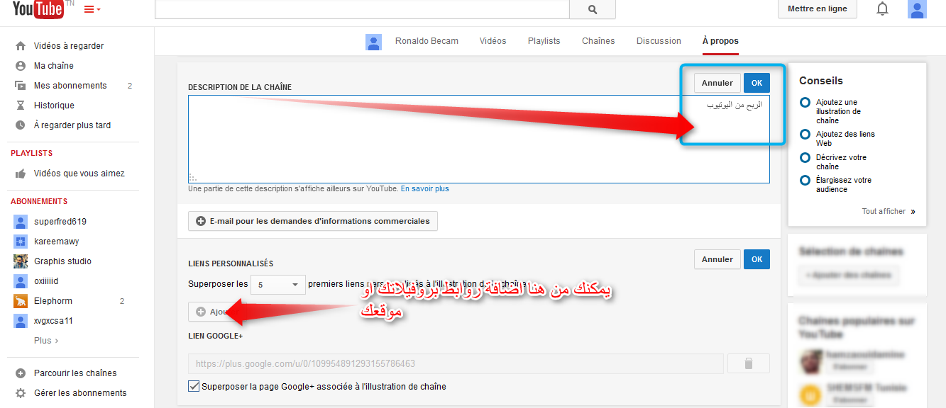 و بعد الدخول على موقع اليوتيوب اضغط على قناتك و قم بادخال المعلومات كما تبينه الصورة